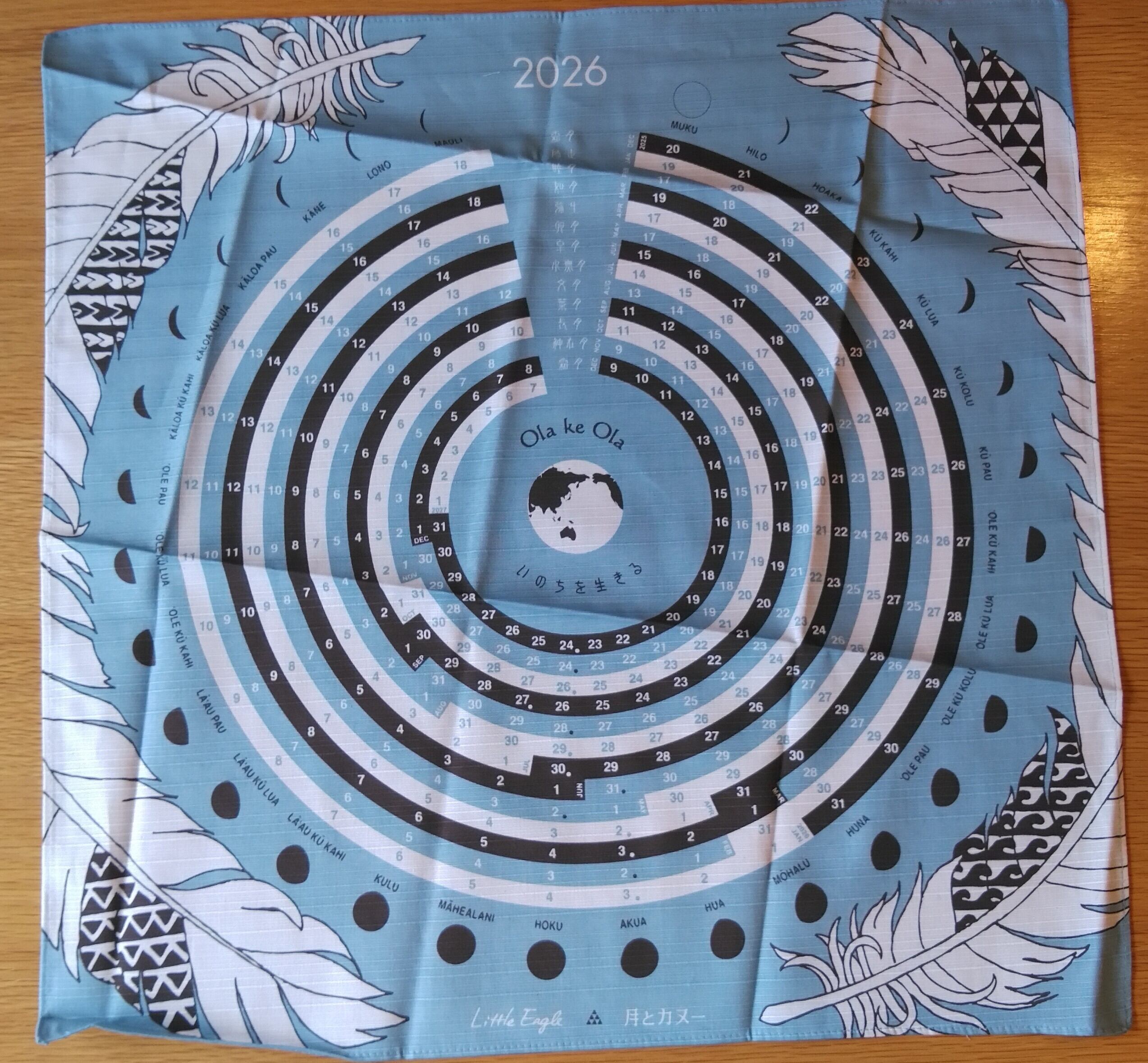「月とカヌー」と洋服ブランド「Little Eagle(リトルイーグル)」のコラボレーション作品。ハワイに伝わる伝統的な暦と日本の旧暦をあわせたムーンカレンダーです。